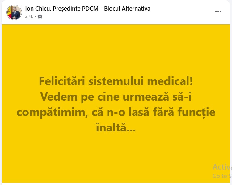„Felicitări sistemului medical! Vedem pe cine urmează să-i compătimim, că n-o lasă fără funcție înaltă...”, a scris Ion Chicu.