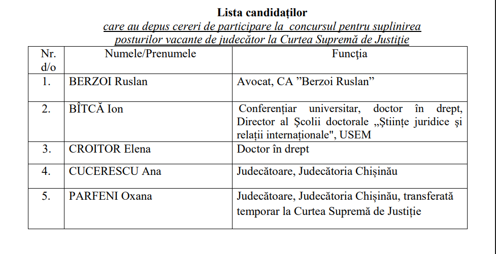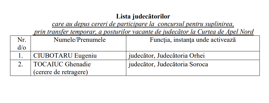 Plenul CSM desfășoară concursul pentru suplinirea, prin transfer temporar, a funcției vacante de judecător la Curtea de Apel Nord. Tocaiuc Ghenadie a depus, anterior, o cerere de retragere, pe care CSM a acceptat-o.