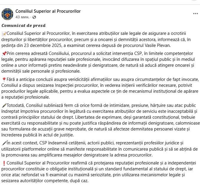 „Prin cererea adresată, procurorul a solicitat intervenția CSP, în limitele competențelor legale, pentru apărarea reputației sale profesionale, invocând difuzarea în spațiul public și în mediul online a unor informații pretins neadevărate și denigratoare, de natură să aducă atingere onoarei și demnității sale personale și profesionale.