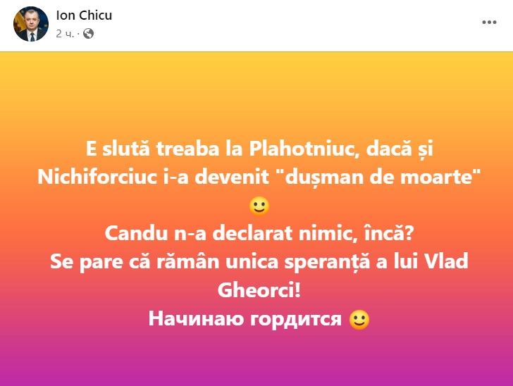 Se pare că rămân unica speranță a lui Vlad Gheorci! Начинаю гордится”, a scris Ion Chicu pe pagina sa de facebook.