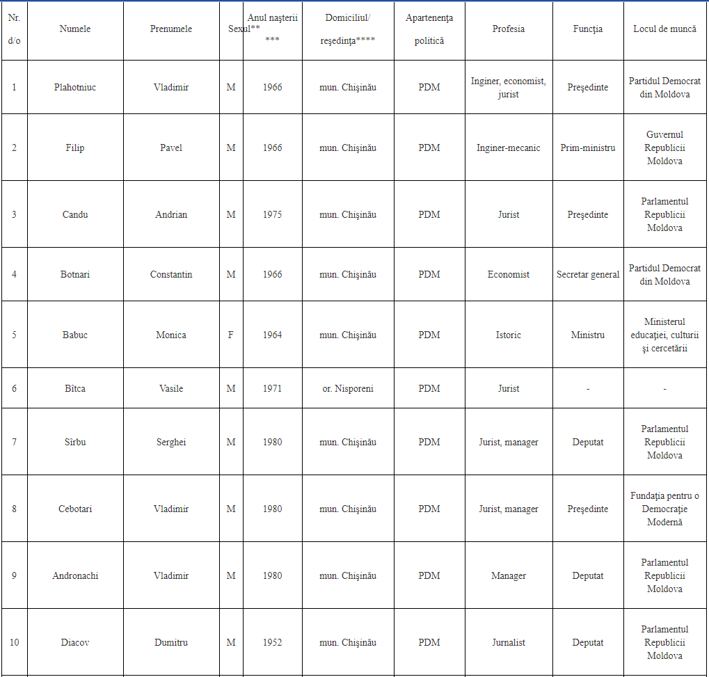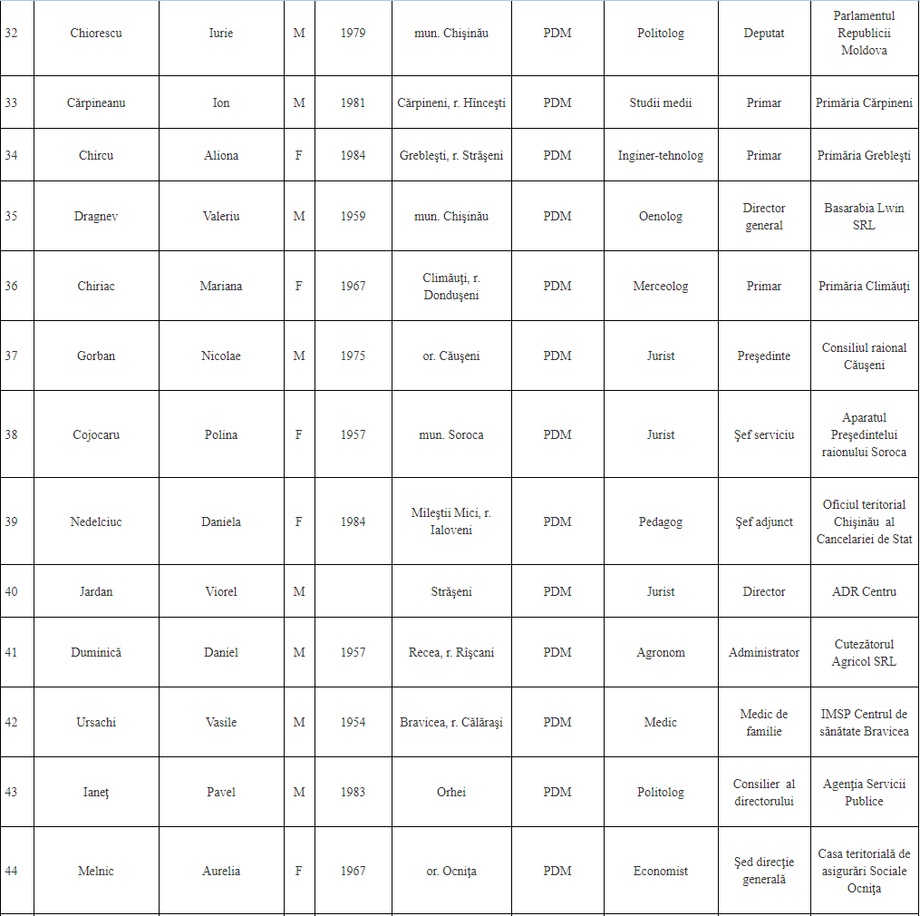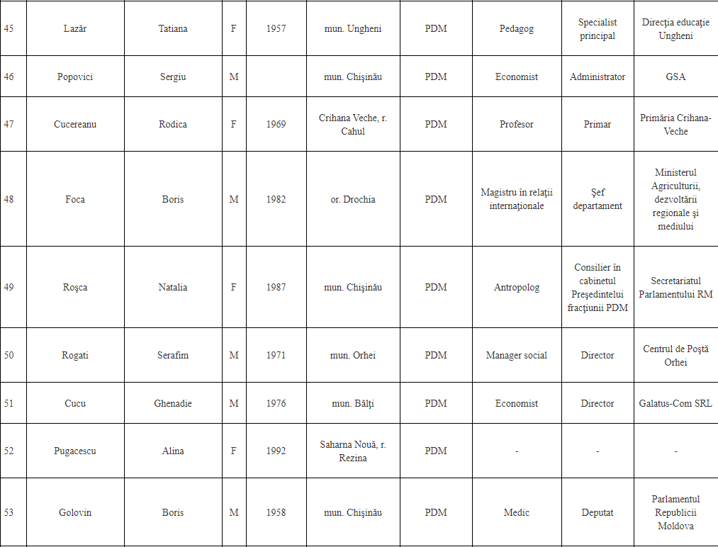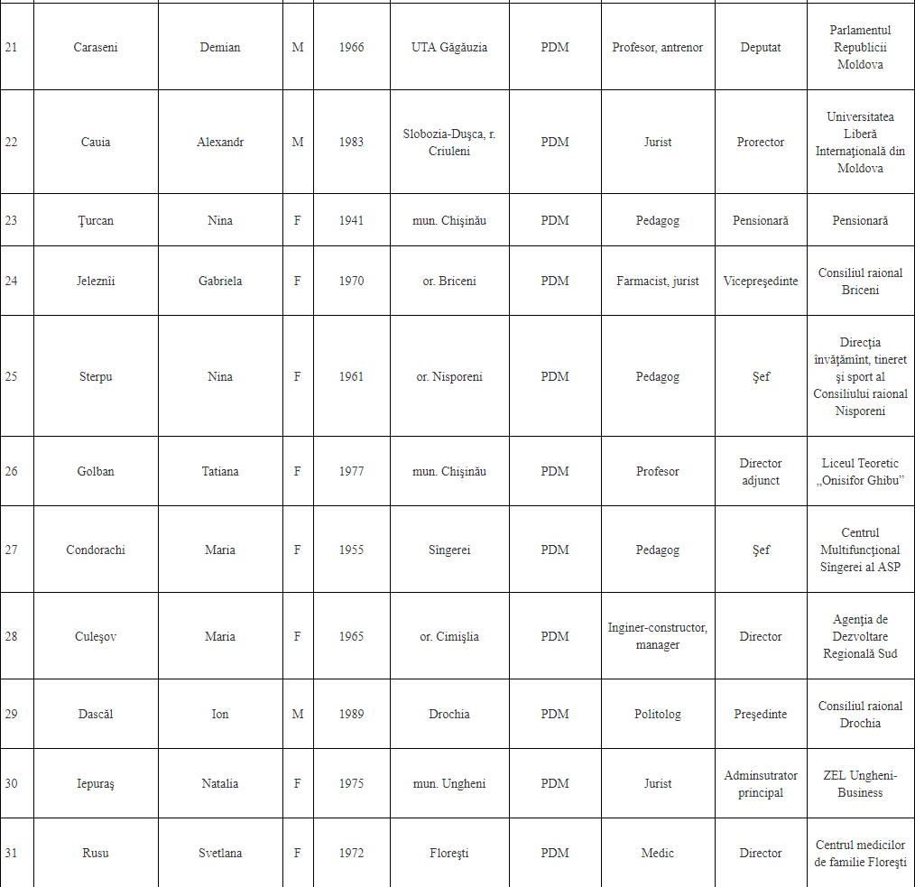 Vlad Plahotniuc este primul pe lista cricumsrcripției naționale, urmat premierul Pavel FIlip și preșezintele Parlamentului Andrian Candu. Ministrul Sănătății și fostul candidat pentru Primăria Chișinău, Silvia Radu, candidează pe poziția 20 pe lista PDM.