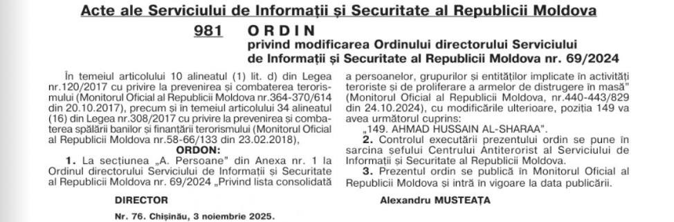 Actualizarea a fost făcută prin Ordinul nr. 981 din 3 noiembrie 2025, emis de conducerea instituției. Potrivit documentului, pe lista consolidată a fost introdus numele Ahmad Hussain Al-Sharaa, care figurează la poziția 149.