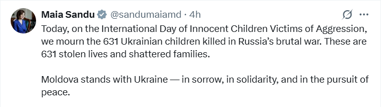 „Astăzi, în Ziua Internațională a Copiilor Nevinovați Victime ale Agresiunii, deplângem pe cei 631 de copii ucraineni uciși în războiul brutal al Rusiei. Acestea sunt 631 de vieți furate și familii distruse.