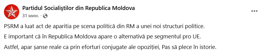 E important că în Republica Moldova apare o alternativă pe segmentul pro UE”, au scris reprezentanții PSRM pe rețele.