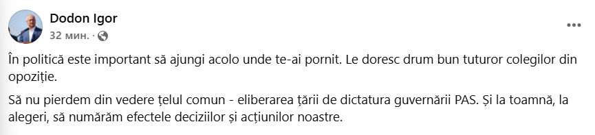 Să nu pierdem din vedere țelul comun - eliberarea țării de dictatura guvernării PAS. Și la toamnă, la alegeri, să numărăm efectele deciziilor și acțiunilor noastre”, a scris liderul PSRM pe pagina sa de Facebook.