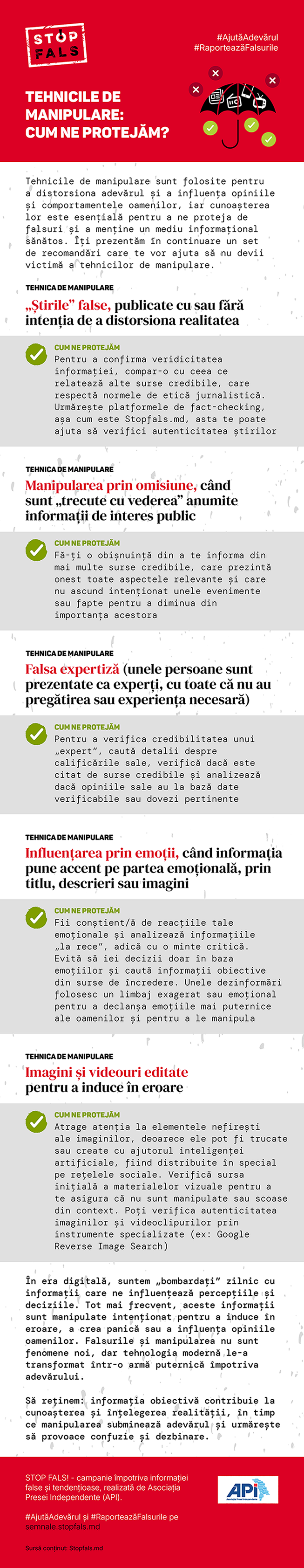 STOP FALS! - campania împotriva informației false și tendențioase, realizată de Asociația Presei Independente (API), prezintă în infograficul de mai jos cele mai răspândite tehnici de manipulare, oferind sfaturi practice pentru a ne proteja împotriva acestora. #NuDezinformării #RaporteazăFalsurile