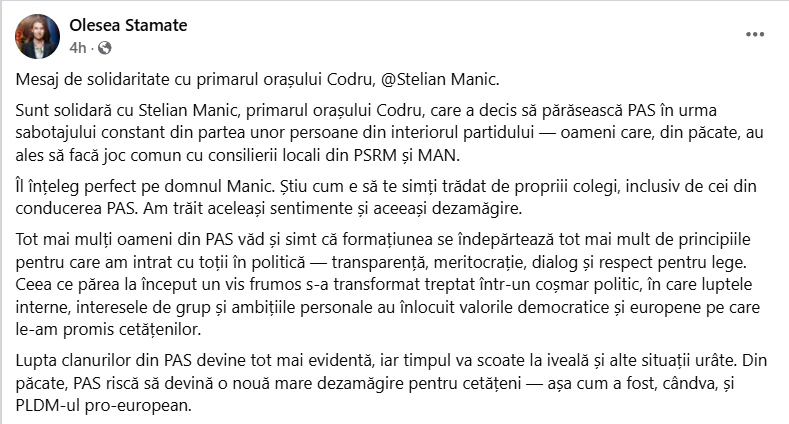„Sunt solidară cu Stelian Manic, primarul orașului Codru, care a decis să părăsească PAS în urma sabotajului constant din partea unor persoane din interiorul partidului — oameni care, din păcate, au ales să facă joc comun cu consilierii locali din PSRM și MAN.