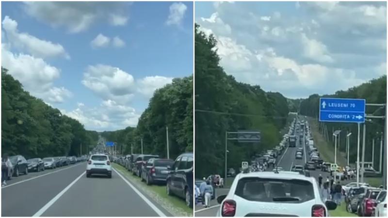 În acestea se observă aglomerație pe ambele sensuri, iar în afara traseului sunt parcate numeroase automobile.