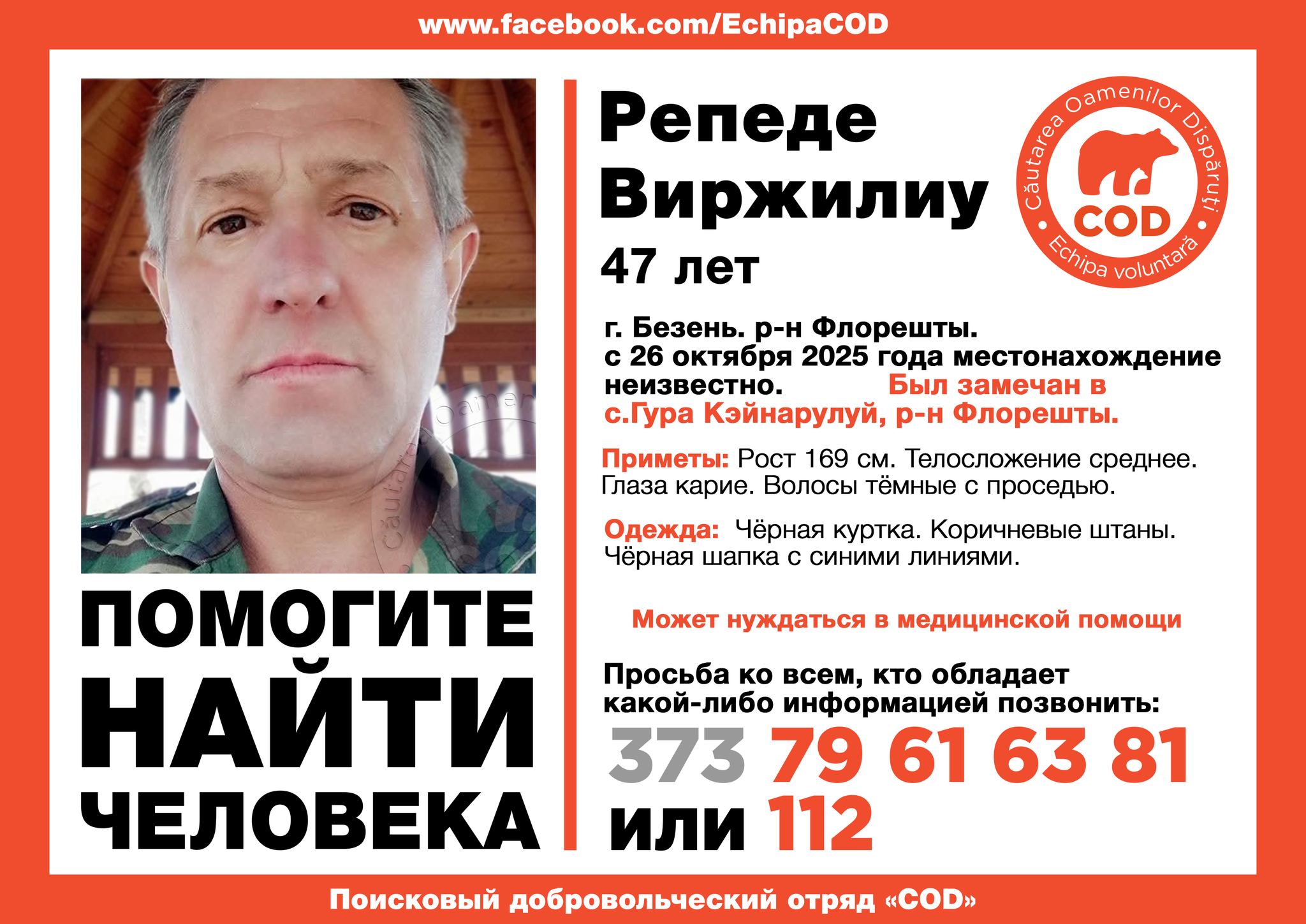 Conform unui mesaj al echipei de căutare „COD”, bărbatul ar fi fost observat ultima dată în satul Gura Căinarului din raionul Florești.