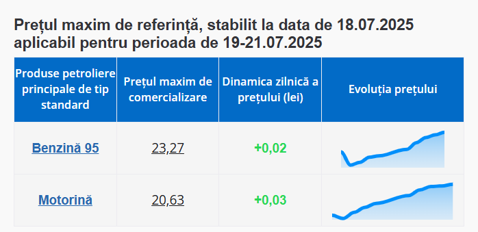 Agenția Națională pentru Reglementare Energetică a afișat noile prețuri la carburanți, pentru zilele de weekend 19 - 21 iulie. Astfel, prețul la benzină crește cu 2 bani, iar cel la motorină - cu 3 bani.