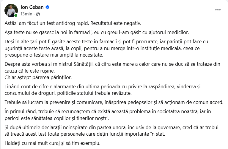 „Astăzi am făcut un test antidrog rapid. Rezultatul este negativ.