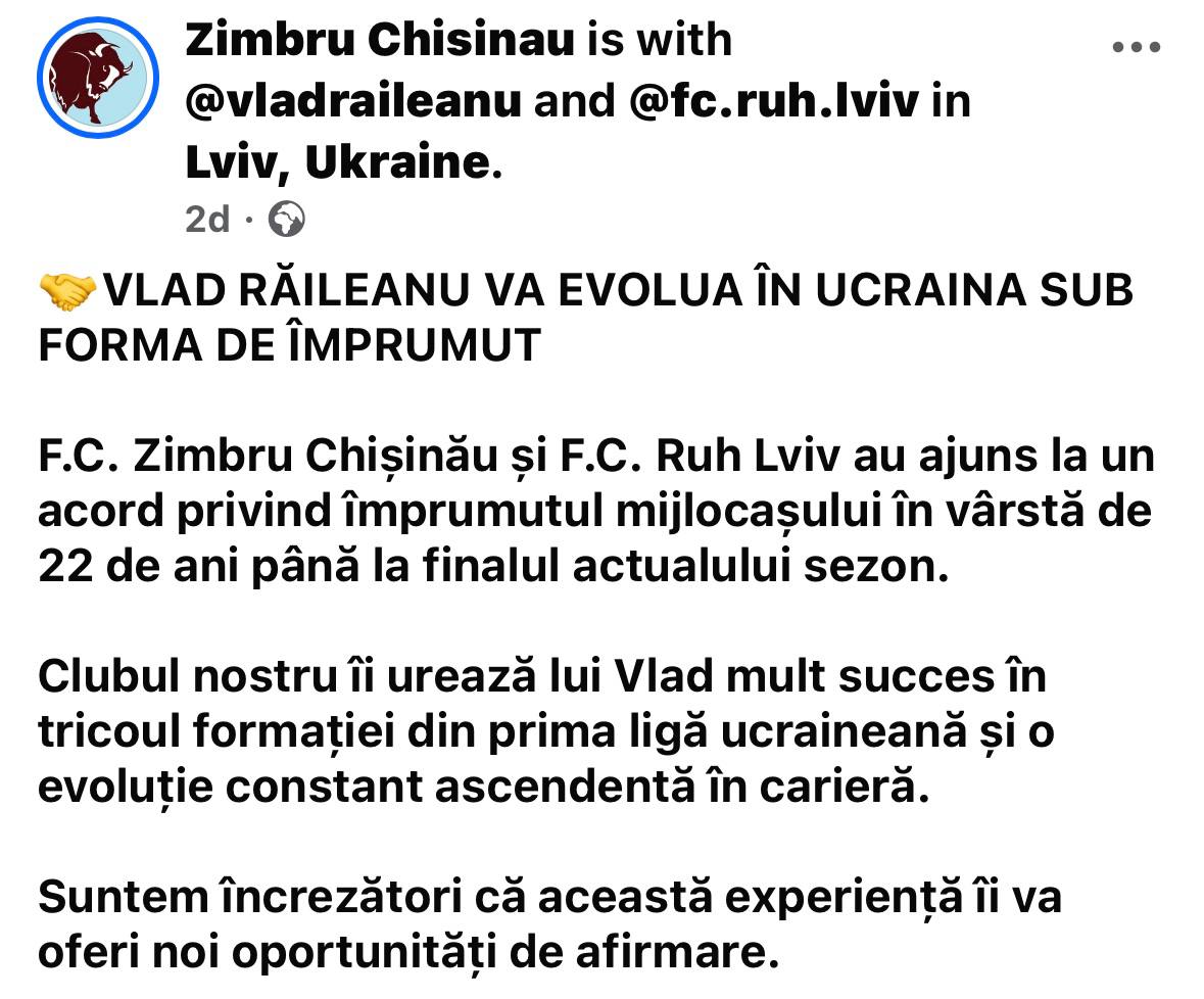 Fotbalistul Vlad Răileanu va evolua în Ucraina sub formă de împrumut. F.C. Zimbru Chișinău și F.C. Ruh Lviv au ajuns la un acord privind împrumutul mijlocașului în vârstă de 22 de ani până la finalul actualului sezon, anunță clubul din Moldova.