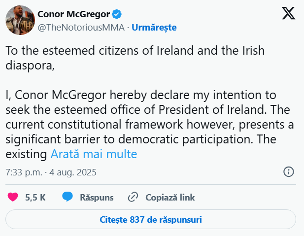 Departe de octogon- nu a mai luptat din 2021 - starul UFC, campion la categoria pană şi welter între 2015 şi 2018, a lansat luni, pe contul său X, o petiţie pentru ca irlandezii să-l susţină în dorinţa sa de a candida la alegerile prezidenţiale, care vor avea loc la 11 noiembrie.