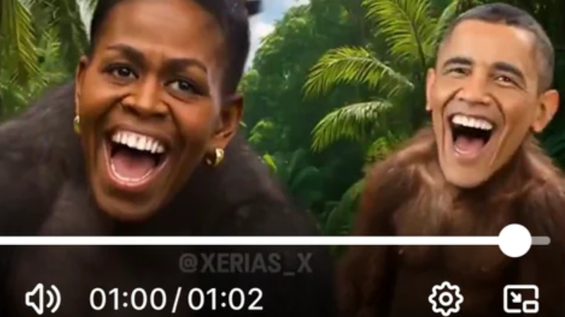 Spre finalul clipului, care durează aproximativ un minut și a fost publicat pe platforma Truth Social a lui Trump, cei doi apar timp de circa o secundă cu fețele suprapuse pe corpurile unor maimuțe.