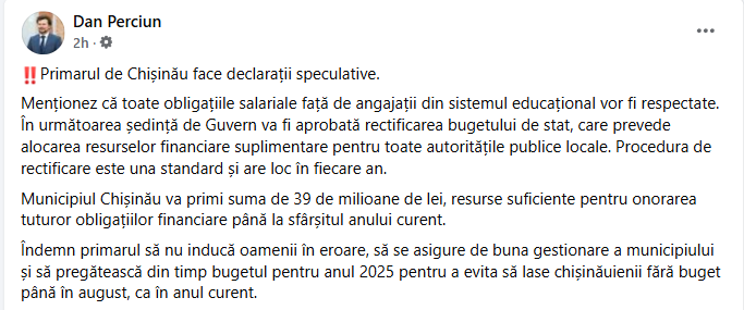 Îndemn primarul să nu inducă oamenii în eroare, să se asigure de buna gestionare a municipiului și să pregătească din timp bugetul pentru anul 2025 pentru a evita să lase chișinăuienii fără buget până în august, ca în anul curent”, a scris Perciun.