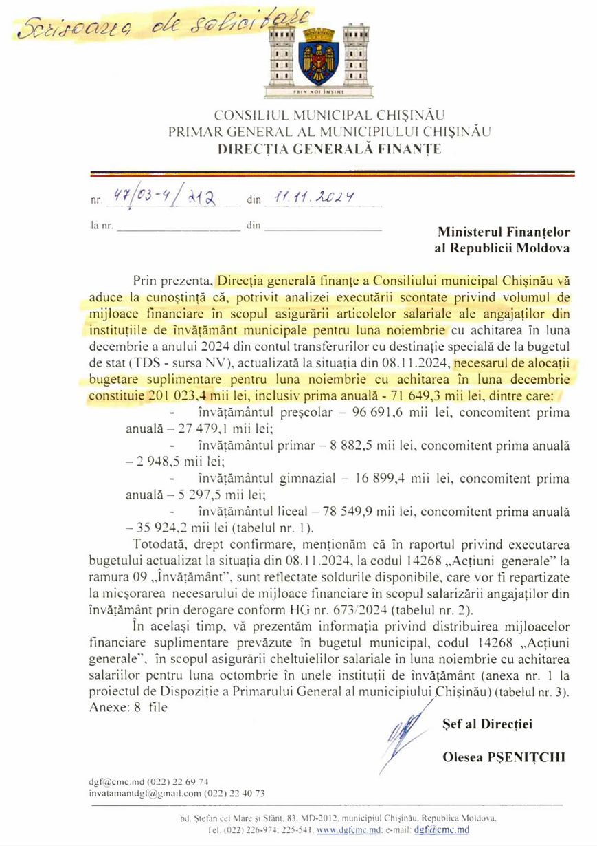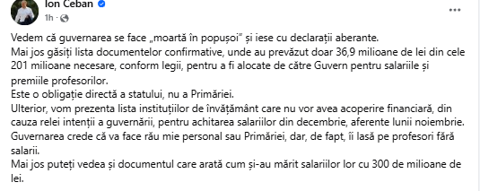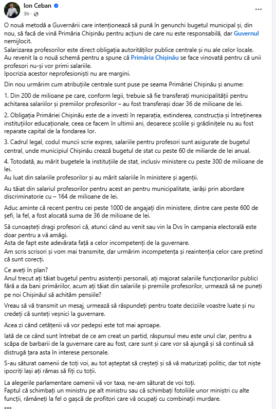 În continuare, Ceban a venit cu o altă postare și prezintă „lista documentelor confirmative, unde au prevăzut doar 36,9 milioane de lei din cele 201 milioane necesare, conform legii, pentru a fi alocate de către Guvern pentru salariile și premiile profesorilor.”