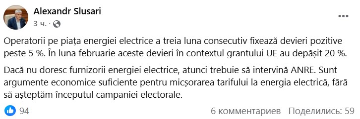 Dacă nu doresc furnizorii energiei electrice, atunci trebuie să intervină ANRE. Sunt argumente economice suficiente pentru micșorarea tarifului la energia electrică, fără să așteptăm începutul campaniei electorale”, a scris Alexandr Slusari.