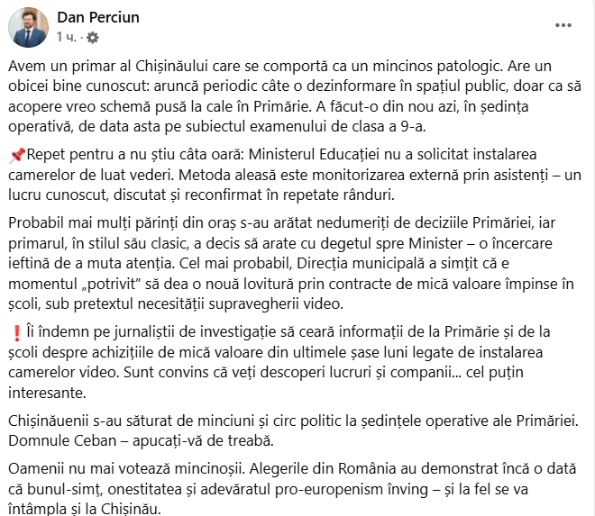 Probabil mai mulți părinți din oraș s-au arătat nedumeriți de deciziile Primăriei, iar primarul, în stilul său clasic, a decis să arate cu degetul spre Minister – o încercare ieftină de a muta atenția. Cel mai probabil, Direcția municipală a simțit că e momentul „potrivit” să dea o nouă lovitură prin contracte de mică valoare împinse în școli, sub pretextul necesității supravegherii video”, a notat dan Perciun.