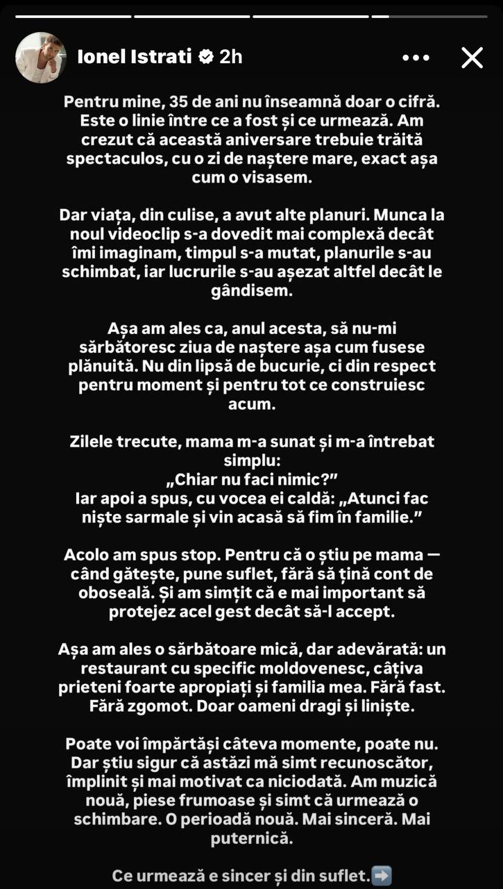 „Pentru mine, 35 de ani nu înseamnă doar o cifră. Este o linie între ce a fost și ce urmează. Am crezut că această aniversare trebuie trăită spectaculos, cu o zi de naștere mare, exact așa cum o visasem. Dar viața, din culise, a avut alte planuri. Munca la noul videoclip s-a dovedit mai complexă decât îmi imaginam, timpul s-a mutat, planurile s-au schimbat, iar lucrurile s-au așezat altfel decât le gândisem.