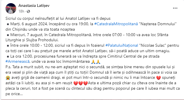 Maestrul Anatol Latîșev va fi petrecut miercuri, 7 august, pe ultimul drum. La ora 12:00 procesiunea funerară se va îndrepta spre Cimitirul Central de pe strada Armenească, unde va avea loc înmormântarea.