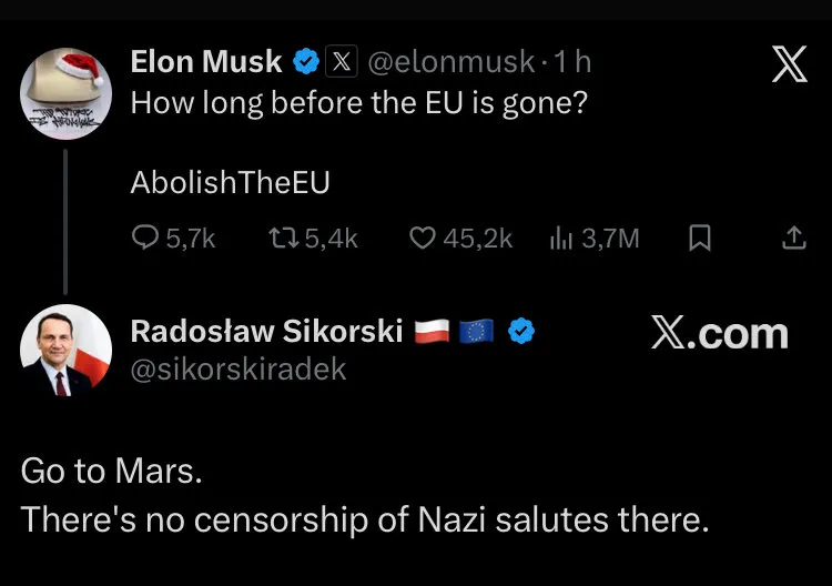 Radosław Sikorski a reaprins o dispută mai veche cu omul de afaceri după ce acesta a scris pe platforma sa, X: „Cât va mai dura până când UE va dispărea? AbolishTheEU – „EradicațiUE”.