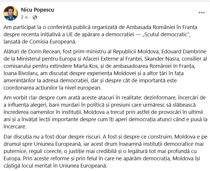 Dar discuția nu a fost doar despre riscuri. A fost și despre ce construim. Moldova e pe drumul spre Uniunea Europeană, iar acest drum înseamnă instituții democratice mai puternice, reguli corecte, o justiție mai credibilă și o legătură tot mai profundă cu Europa. Prin aceste reforme și prin felul în care ne apărăm democrația, Moldova își câștigă locul meritat în Uniunea Europeană”, a scris Nicu Popescu.