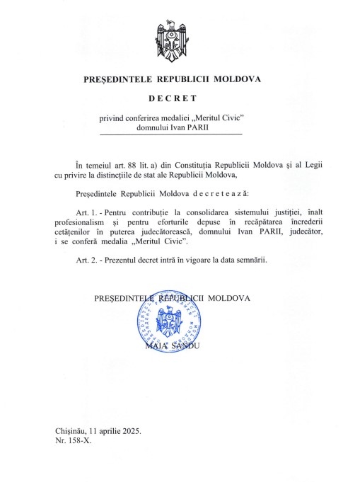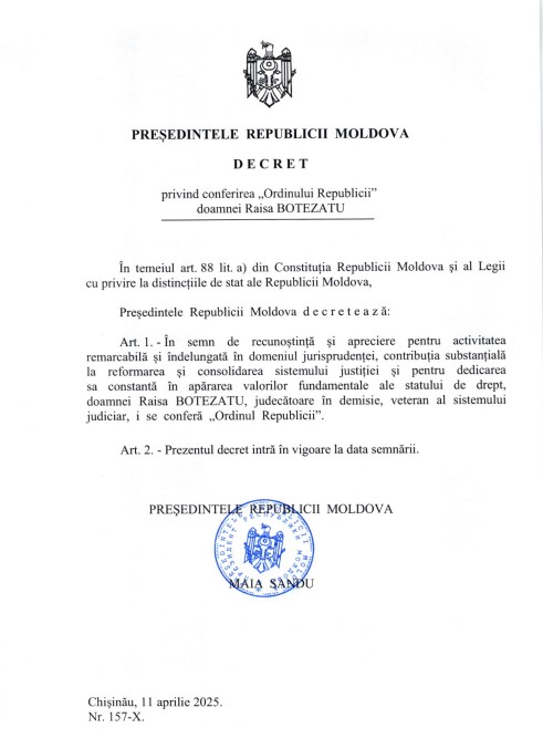 Președinta Maia Sandu a conferit „Ordinul Republicii” judecătoarei în demisie Raisa Botezatu, veteran al sistemului judiciar, iar magistratul Ivan Parii a fost decorat cu medalia „Meritul Civic”.