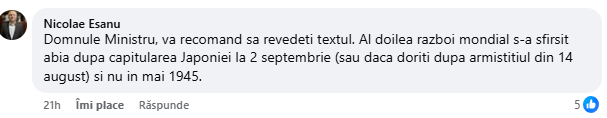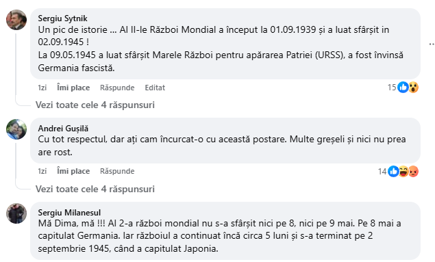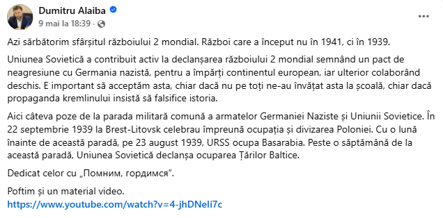 „Azi sărbătorim sfârșitul războiului 2 mondial. Război care a început nu în 1941, ci în 1939.
