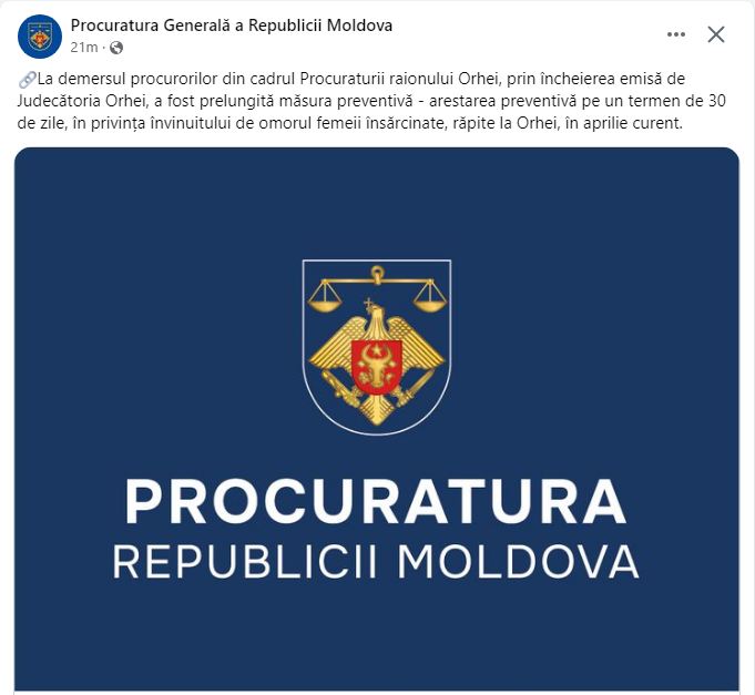 „La demersul procurorilor din cadrul Procuraturii raionului Orhei, prin încheierea emisă de Judecătoria Orhei, a fost prelungită măsura preventivă - arestarea preventivă pe un termen de 30 de zile, în privința învinuitului de omorul femeii însărcinate, răpite la Orhei, în aprilie curent”, au comunicat responsabilii de la Procuratura Generală a Republicii Moldova.