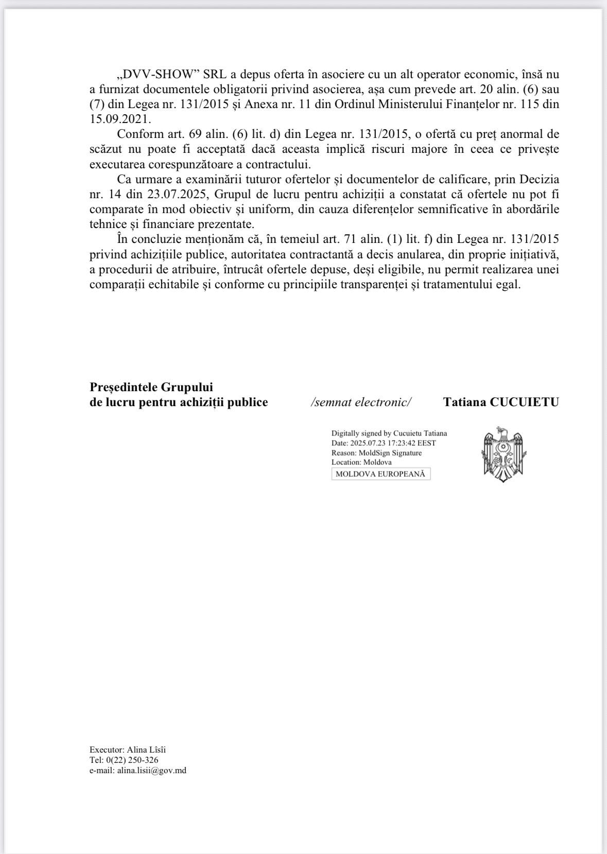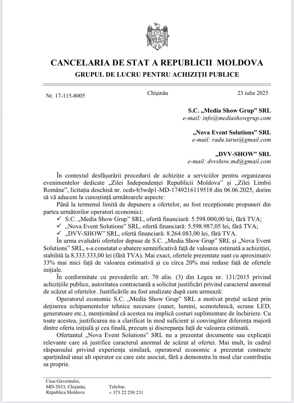Ulterior, Guvernul a dat o explicație de ce nu a organizat o licitație publică pentru concertul de 3 zile, cu ocazia Zilei Independenței. Potrivit Executivului, banii necesari pentru organizarea sărbătorii au fost alocați după rectificarea bugetară din luna iulie, iar „termenele au fost restrânse”.