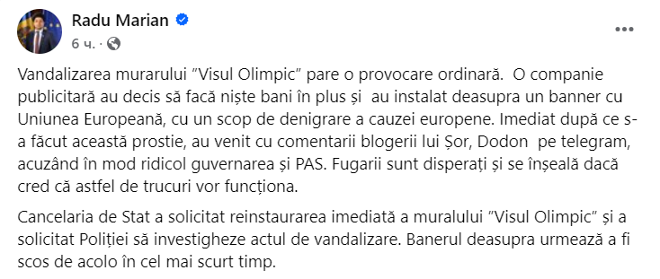 „O companie publicitară a decis să facă niște bani în plus și au instalat deasupra un banner cu Uniunea Europeană, cu un scop de denigrare a cauzei europene”, a mai adăugat parlamentarul în mesajul său de pe pagina de Facebook.
