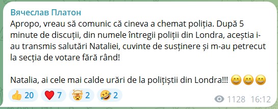 „Apropo, vreau să comunic că cineva a chemat poliția. După 5 minute de discuții, din numele întregii poliții din Londra, aceștia i-au transmis salutări Nataliei, cuvinte de susținere și m-au petrecut la secția de votare fără rând!