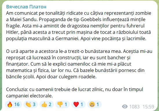 „Am comunicat pe tonalități ridicate cu câțiva reprezentanți zombie ai Maiei Sandu. Propaganda de tip Goebbels influențează mințile fragile. Asta mi-a amintit de dragostea nemților pentru fuhrerul Hitler, până acesta a trecut prin mașina de tocat a războiului toată populația masculină a Germaniei. Apoi vine pocăința și lacrimile.