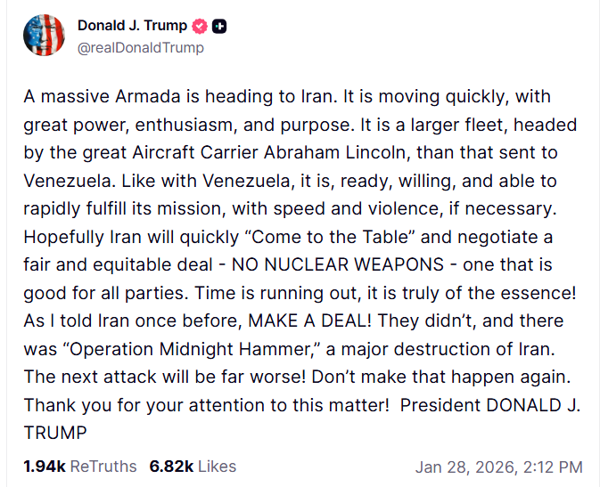 „O armadă masivă se îndreaptă spre Iran. Se mișcă rapid, cu mare putere, entuziasm și determinare. Este o flotă mai mare decât cea trimisă în Venezuela, condusă de marele portavion Abraham Lincoln. La fel ca în cazul Venezuelei, este pregătită, dispusă și capabilă să-și îndeplinească rapid misiunea, cu viteză și violență, dacă este necesar”, a scris liderul american.