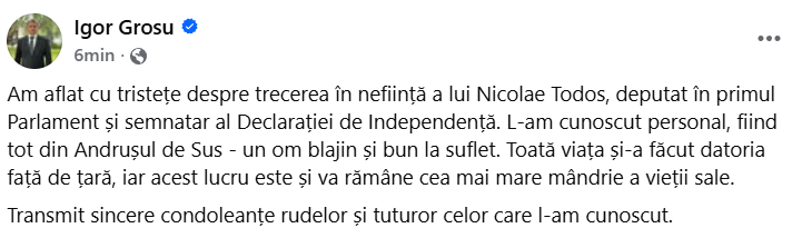 Transmit sincere condoleanțe rudelor și tuturor celor care l-am cunoscut”, a scris Grosu pe rețele.