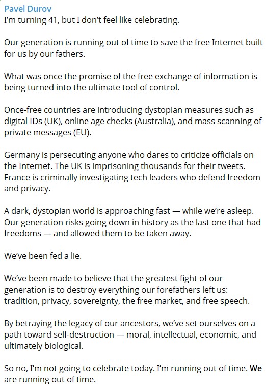 Așa că nu, nu voi sărbători astăzi. Timpul meu se termină. Timpul nostru se termină”, a scris fondatorul Telegram.
