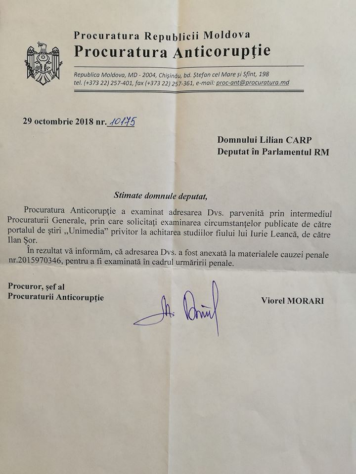 Carp spune că răspunsul l-a primit de la procurorul-șef al Procuraturii Anticorupție, Viorel Morari.