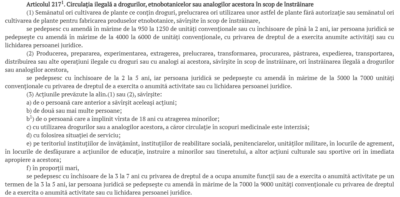 Articolul 217¹ din Codul Penal al Republicii Moldova se referă la „circulația ilegală a drogurilor, etnobotanicelor sau analogilor acestora în scop de înstrăinare”.