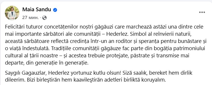 „Felicitări tuturor concetățenilor noștri găgăuzi care marchează astăzi una dintre cele mai importante sărbători ale comunității – Hederlez. Simbol al reînvierii naturii, această sărbătoare reflectă credința într-un an roditor și speranța pentru bunăstare și o viață îndestulată. Tradițiile comunității găgăuze fac parte din bogăția patrimoniului cultural al țării noastre – și acestea trebuie protejate, păstrate și transmise mai departe, din generație în generație.