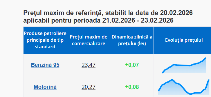 Totodată, motorina va fi comercializată la un preț maxim de 20,27 lei/litru, înregistrând o majorare de 8 bani.