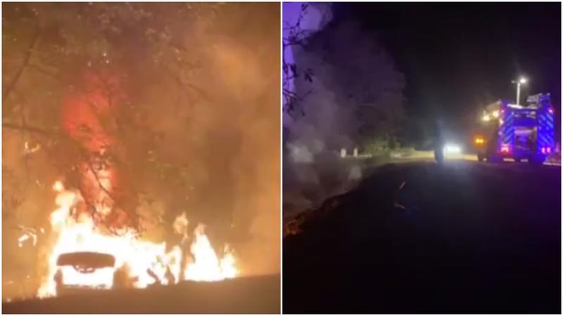Din imagini se vede cum automobilul este, practic, mistuit de flăcări. Acesta a luat foc după ce s-a răsturnat de pe șosea, în timpul unei curse nocturne.