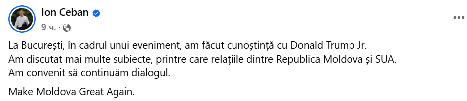 Primarul capitalei, Ion Cebal, s-a văzut cu Donald trump Jr., la București. Oficialii au abordat „mai multe subiecte, printre care relațiile dintre Republica Moldova și SUA”, a menționat liderul MAN.