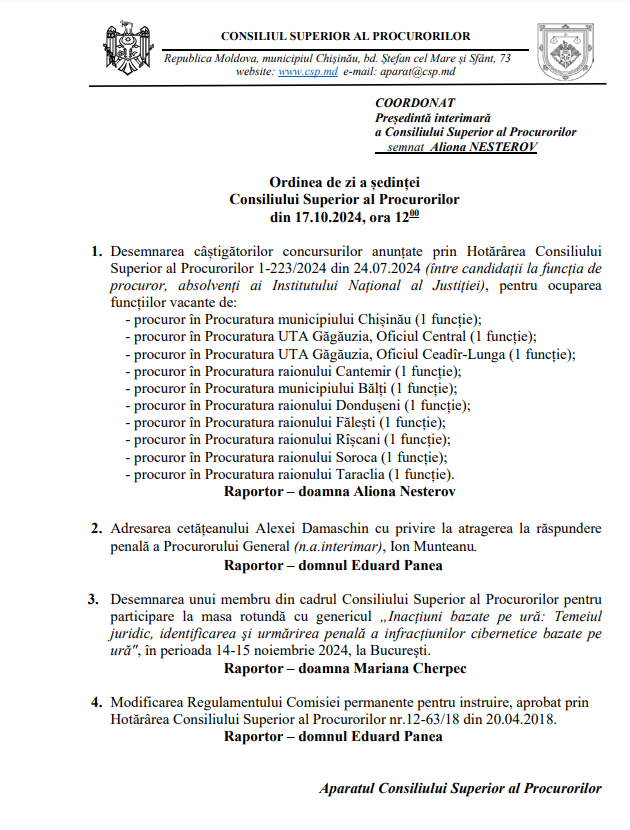 update CSP examinează subiectul privind desemnarea câștigătorilor concursurilor anunțate prin Hotărârea Consiliului Superior al Procurorilor 1-223/2024 din 24.07.2024 (între candidații la funcția de procuror, absolvenți ai Institutului Național al Justiției), pentru ocuparea funcțiilor vacante de: