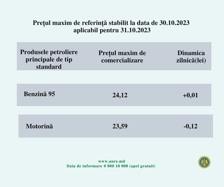 Prin urmare, litrul de benzină va costa 24,12 lei, iar cel la motorină - 23,59 lei.