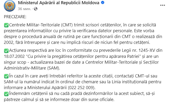 „Acțiunea respectivă are loc în conformitate cu prevederile Legii nr. 1245-XV din 18.07.2002 „Cu privire la pregătirea cetățenilor pentru apărarea Patriei” și are un singur scop - actualizarea bazei de date a Centrelor Militar-Teritoriale și Secțiilor Administrativ-Militare (SAM).