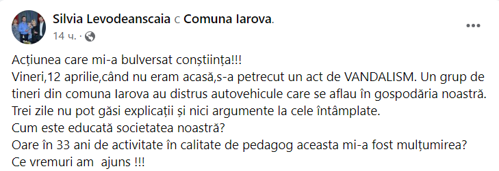 Vineri, 12 aprilie, când nu eram acasă, s-a petrecut un act de vandalism - un grup de tineri din comuna Iarova au distrus autovehiculele care se aflau în gospodăria noastră.