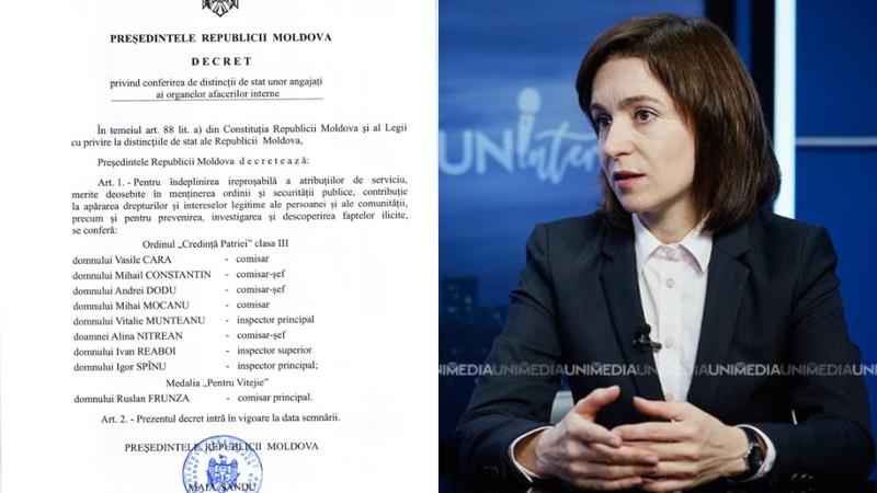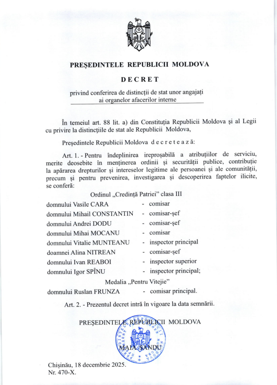 Aceștia au fost decorați prin decret prezidențial cu Ordinul „Credință Patriei” clasa III, pentru îndeplinirea ireproșabilă a atribuțiilor de serviciu, merite deosebite în menținerea ordinii și securității publice, contribuția la apărarea drepturilor și intereselor legitime ale persoanei și ale comunității, precum și pentru activitatea lor în prevenirea, investigarea și descoperirea faptelor ilicite.