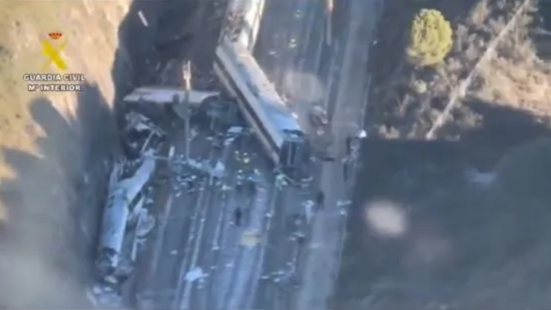 Fotografiile realizate din elicopterul Gărzii Civile arată de sus amploarea dezastrului: vagoane de mare viteză distruse complet și aruncate de pe șine în câmpul de lângă Adamuz.