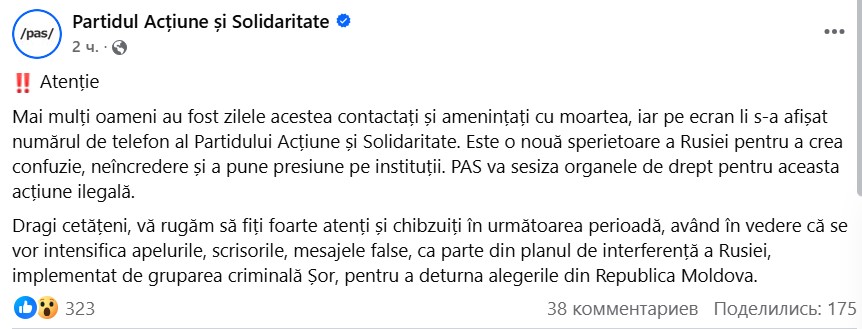 Mai mulți oameni au fost zilele acestea contactați și amenințați cu moartea, iar pe ecran li s-a afișat numărul de telefon al Partidului Acțiune și Solidaritate. Este o nouă sperietoare a Rusiei pentru a crea confuzie, neîncredere și a pune presiune pe instituții. PAS va sesiza organele de drept pentru aceasta acțiune ilegală.