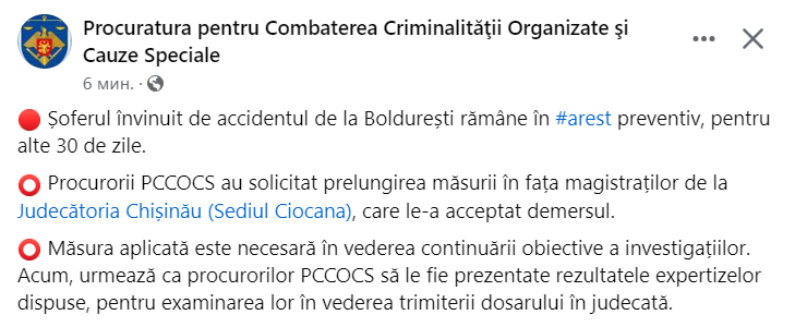„Măsura aplicată este necesară în vederea continuării obiective a investigațiilor. Acum, urmează ca procurorilor PCCOCS să le fie prezentate rezultatele expertizelor dispuse, pentru examinarea lor în vederea trimiterii dosarului în judecată”, se arată în comunicatul emis de reprezentanții PCCOCS.